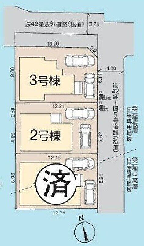 | 駐車場 | 1台 ~ 2台 | 道路の幅員 | 東側4m私道、北側4.7m私道、私道持分/2号棟:15.25m2、3号棟:45.82m2 |