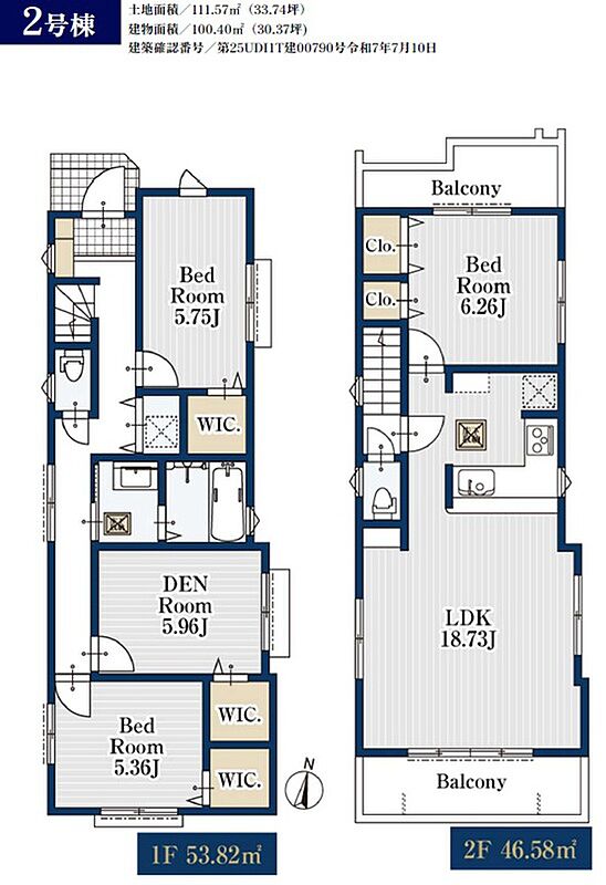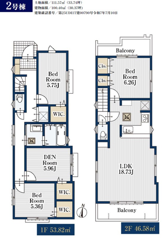 2号棟 間取り 3SLDK+WIC×3 価格 8180万円 建物面積 100.40m2 土地面積 111.57m2