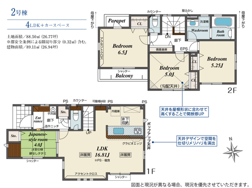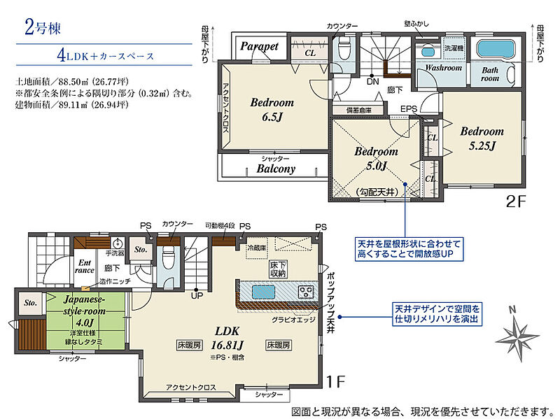 2号棟 間取り 4LDK 価格 6890万円 建物面積 89.11m2 土地面積 88.5m2 -