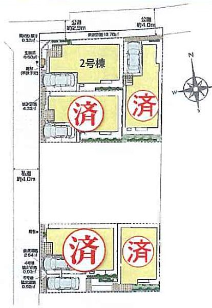 | 駐車場 | 1台 | 道路の幅員 | 西側4m私道、北側2.9m~4m公道、私道持分あり(4.39m2を2号棟と3号棟で1/2ずつ) |