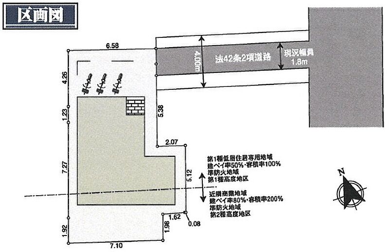 | 駐車場 | 1台 | 道路の幅員 | 東側4m私道、現況道路幅員1.8m |