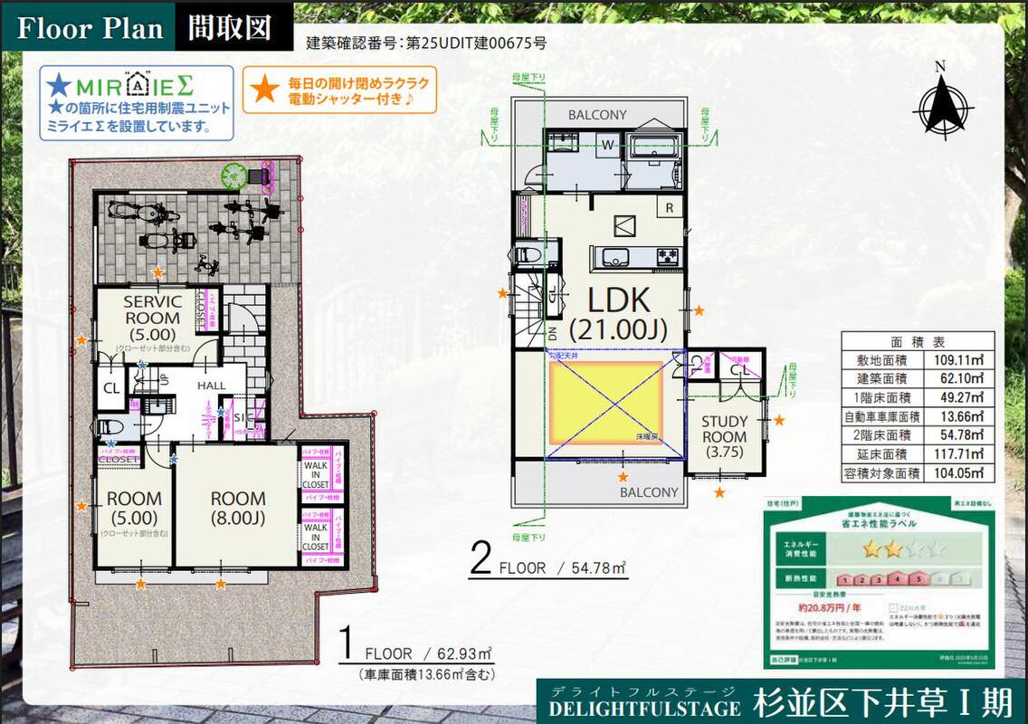 - 間取り 2SLDK+スタディルーム 価格 9490万円 建物面積 117.71m2(車庫面積13.66m2含む) 土地面積 109.11m2