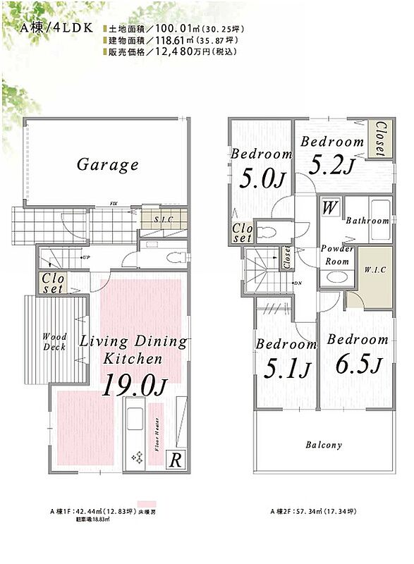 A号棟 間取り 4LDK+WIC+SIC+ウッドデッキ 価格 12480万円 建物面積 118.61m2 土地面積 100.01m2
