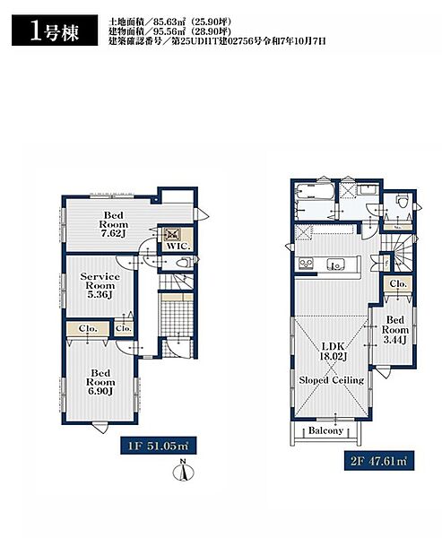 1号棟 間取り 3SLDK+WIC 価格 7080万円 建物面積 95.56m2 土地面積 85.63m2