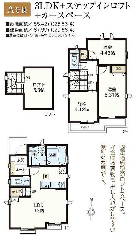 A号棟 間取り 3LDK+ロフト 価格 5990万円 建物面積 67.99m2 土地面積 85.42m2