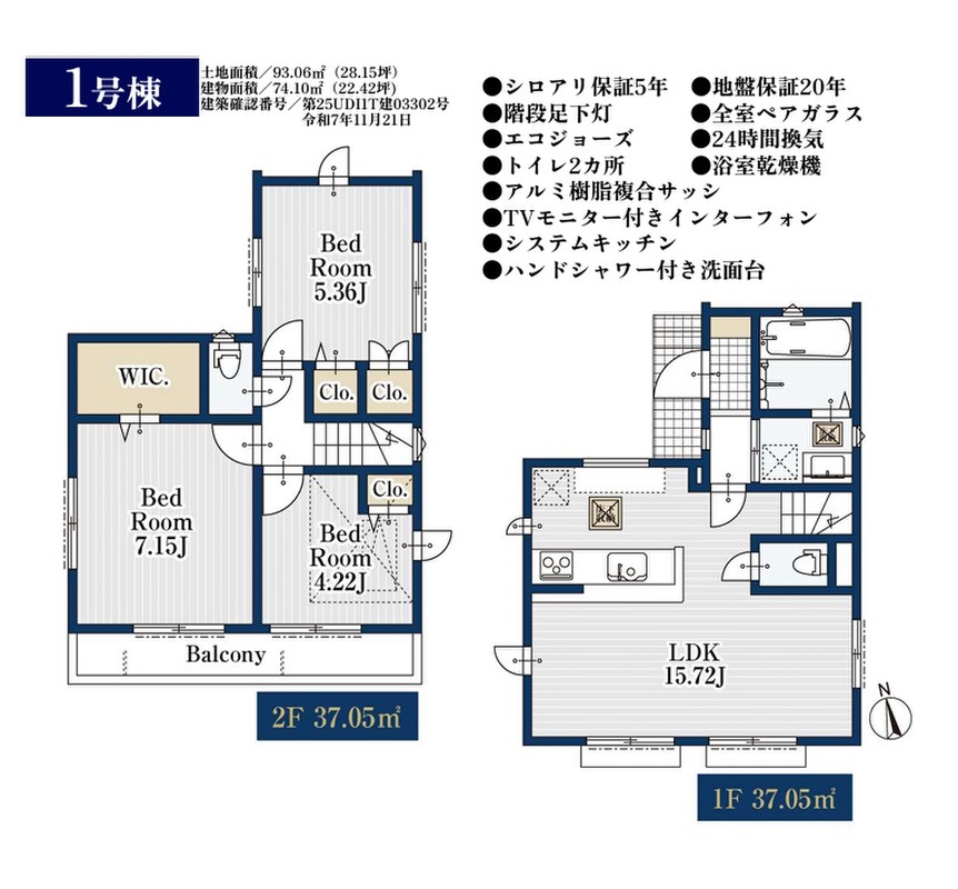 1号棟 間取り 3LDK+WIC+小屋裏収納 価格 5380万円 建物面積 74.10m2 土地面積 93.06m2
