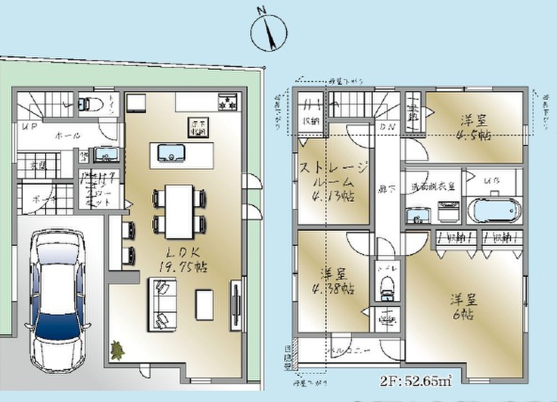2号棟 間取り 3SLDK+WIC 価格 6690万円 建物面積 106.82m2(車庫面積12.46m2含む) 土地面積 76.05m2 -