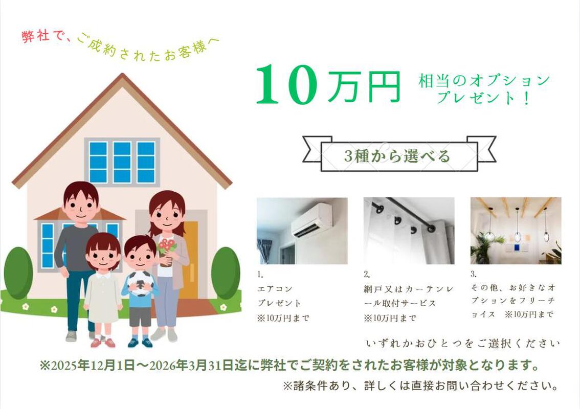 ☆弊社でご成約された方全員に10万円相当のオプションプレゼント!☆