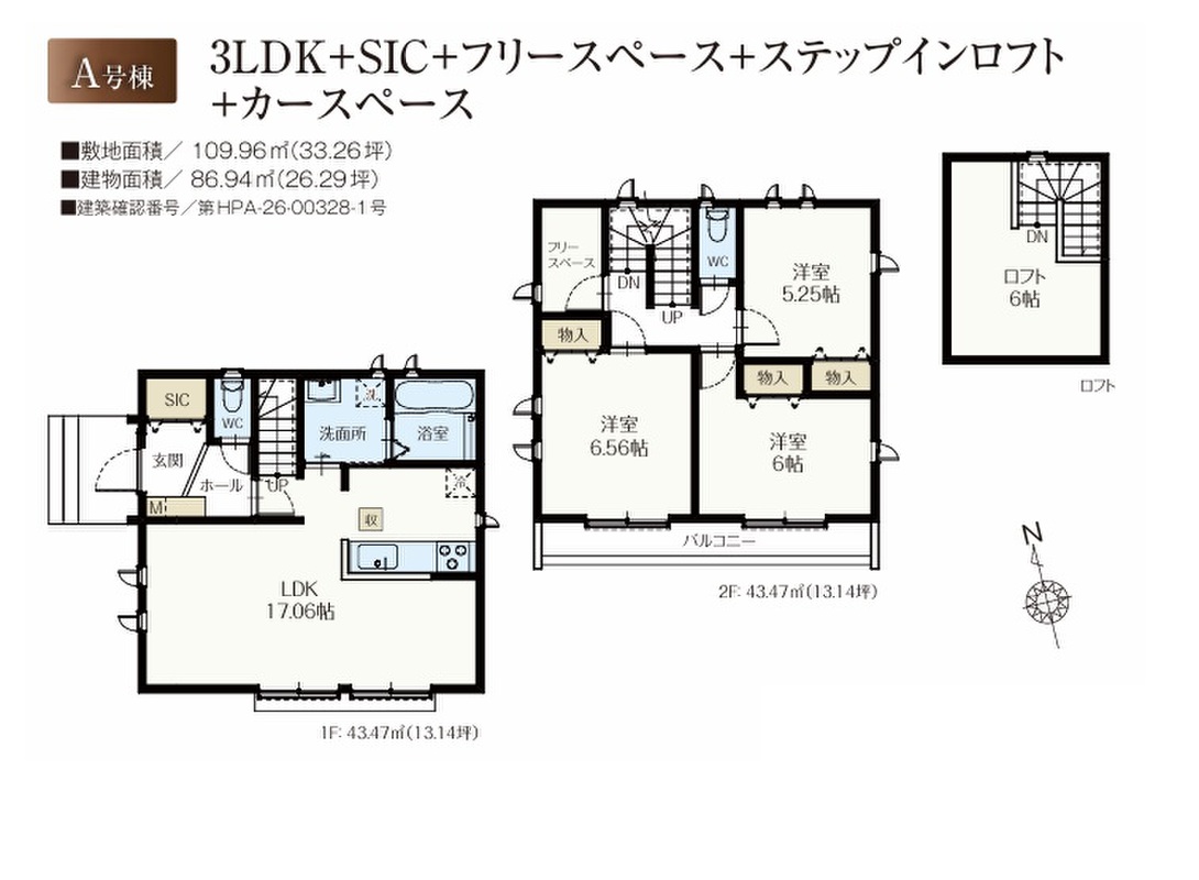 A号棟 間取り 3LDK+SIC+フリースペース+ステップインロフト 価格 6990万円 建物面積 86.94m2 土地面積 109.96m2