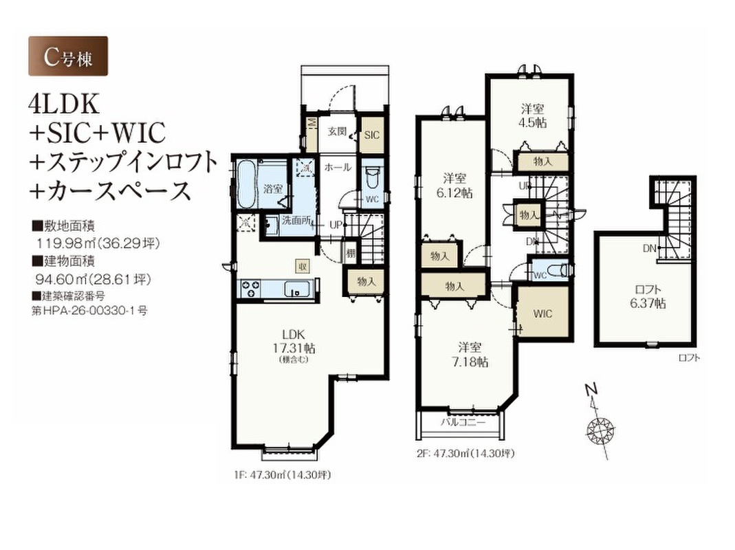 C号棟 間取り 3LDK+SIC+WIC+ステップインロフト 価格 6590万円 建物面積 94.60m2 土地面積 119.98m2 -