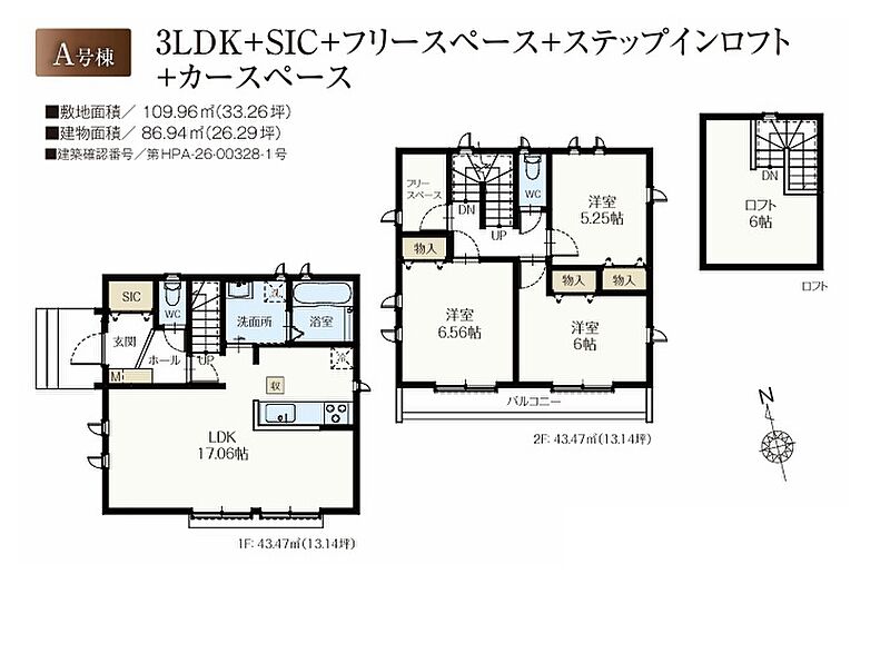 A号棟 間取り 3LDK+SIC+フリースペース+ロフト 価格 6990万円 建物面積 86.94m2 土地面積 109.96m2 -