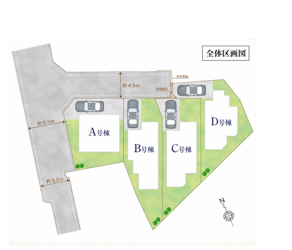 | 駐車場 | 1台 | 道路の幅員 | 西側約6.5m公道、北側約4.5m私道、私道持分92.85m2のうち4/5を各棟1/4 |