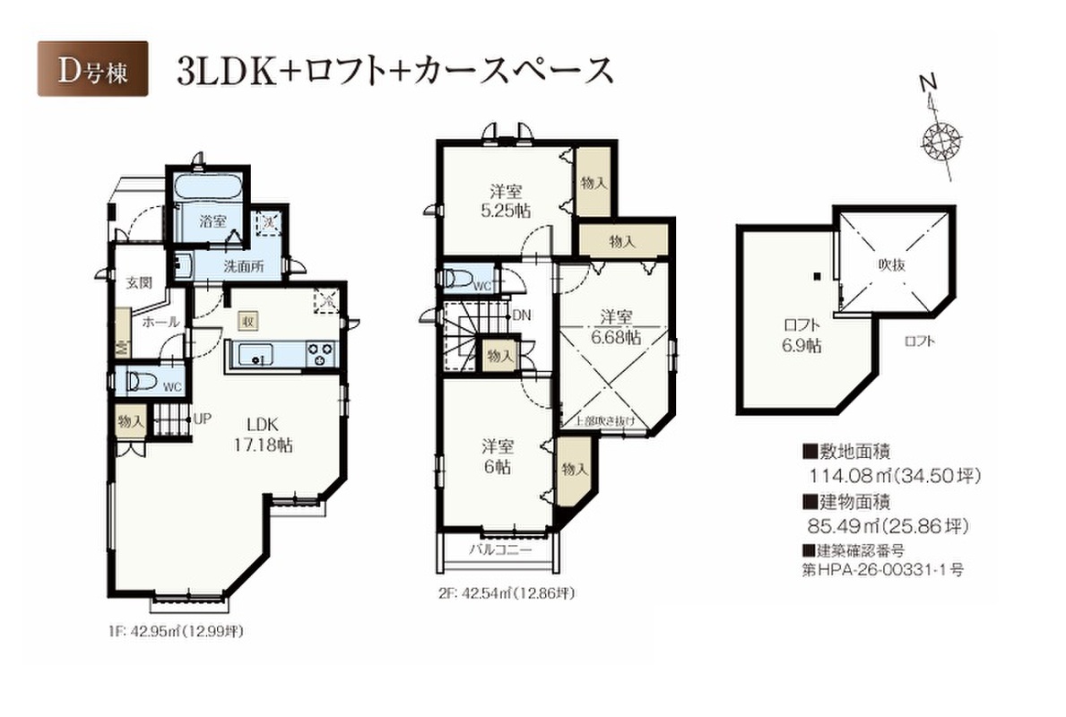 D号棟 間取り 3LDK+ロフト 価格 5990万円 建物面積 85.49m2 土地面積 114.08m2 -