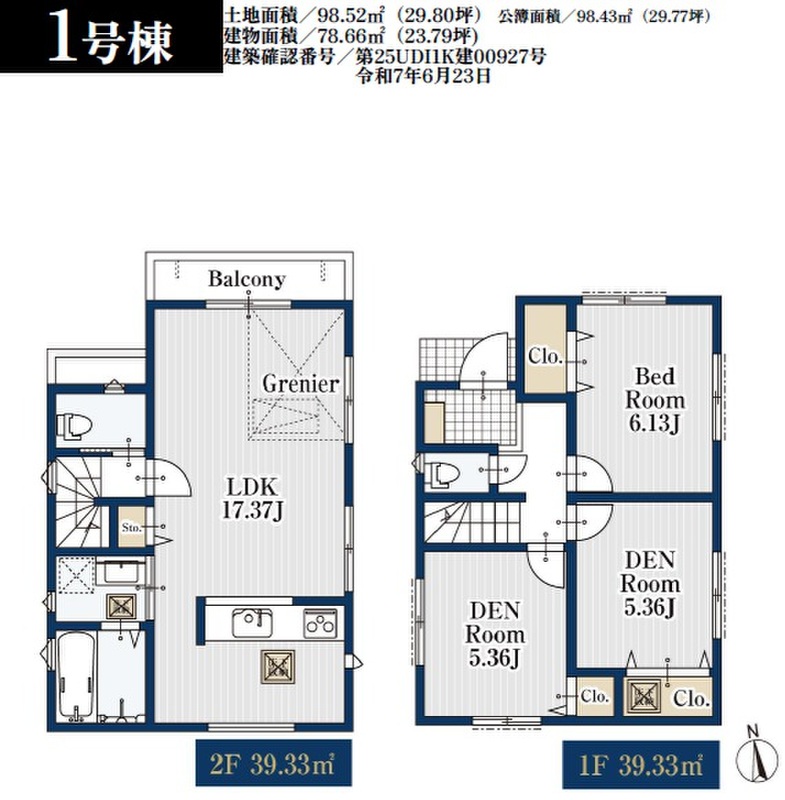 1号棟 間取り 1LDK+2S+小屋裏収納 価格 6780万円 建物面積 78.66m2 土地面積 98.52m2