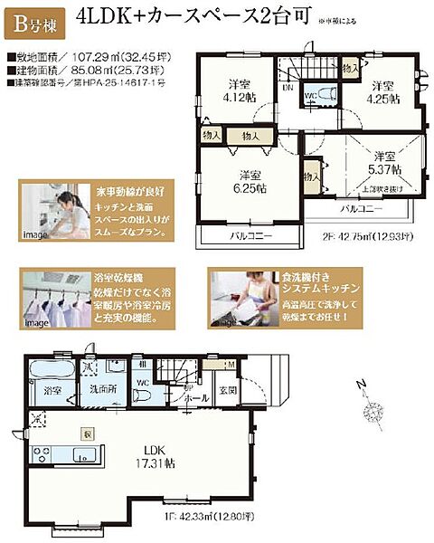 B号棟+カースペース2台可 間取り 4LDK 価格 7180万円 建物面積 85.08m2 土地面積 107.29m2 -
