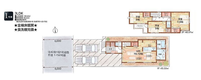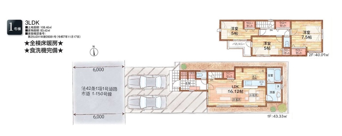 1号棟 間取り 3LDK 価格 6390万円 建物面積 83.42m2 土地面積 108.46m2 -