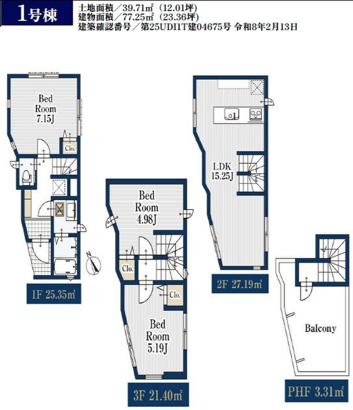 1号棟 間取り 3LDK 価格 4980万円 建物面積 77.25m2 土地面積 39.71m2