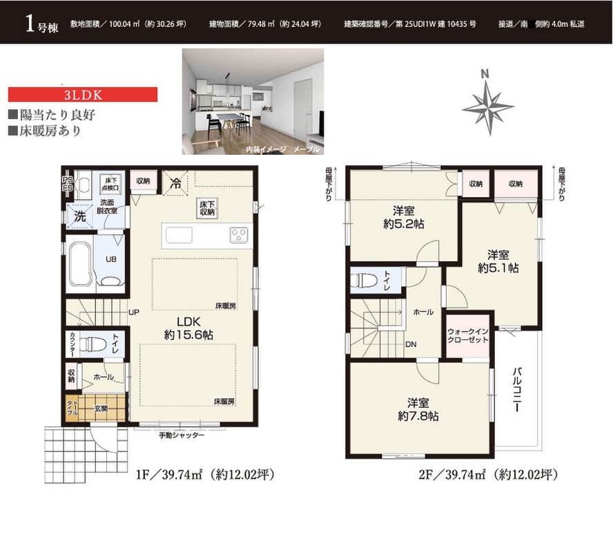 1号棟 間取り 3LDK+WIC 価格 8199万円 建物面積 79.48m2 土地面積 100.04m2