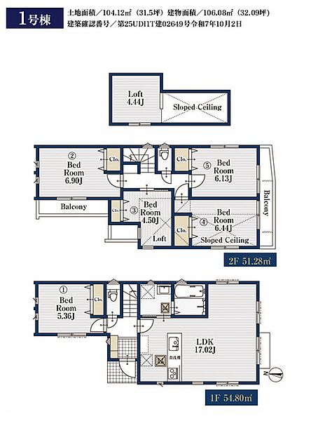 1号棟 間取り 5LDK+ロフト 価格 8380万円 建物面積 106.08m2 土地面積 104.12m2