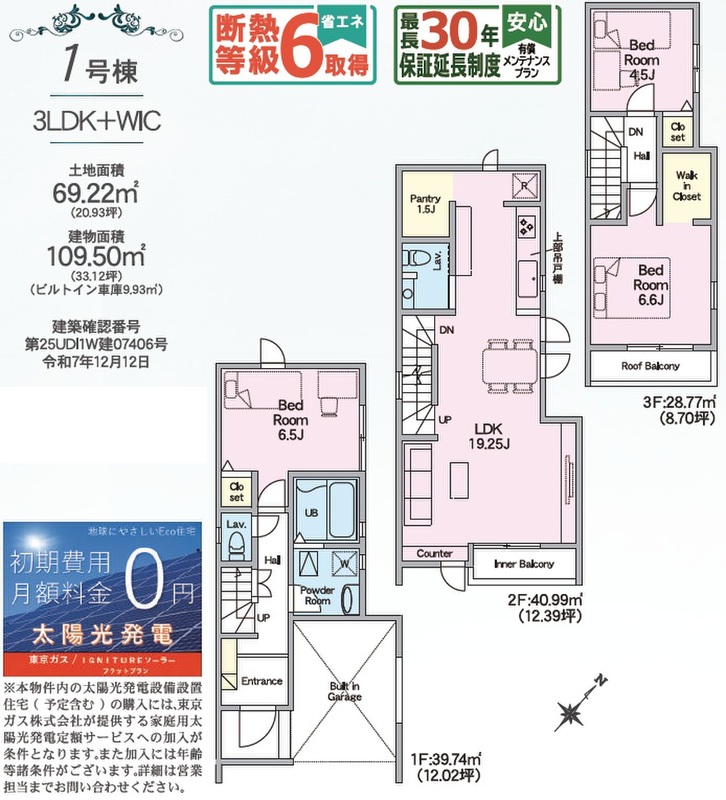 1号棟 間取り 3LDK+WIC+パントリー 価格 10480万円 建物面積 109.50m2(ビルトイン車庫9.93m2) 土地面積 69.22m2