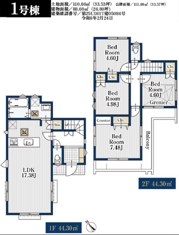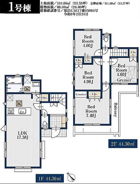 | 建物面積 | 88.60m2 | 土地面積 | 110.86m2 |