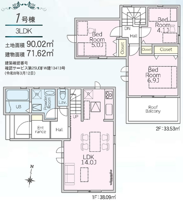 1号棟 間取り 3LDK 価格 6180万円 建物面積 71.62m2 土地面積 90.02m2 -