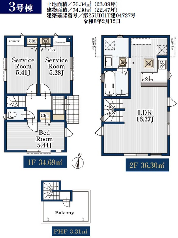3号棟 間取り 1LDK+2S 価格 7080万円 建物面積 74.30m2 土地面積 76.34m2 -
