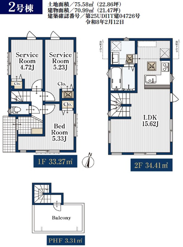 2号棟 間取り 1LDK+2S 価格 7080万円 建物面積 70.99m2 土地面積 75.58m2 -