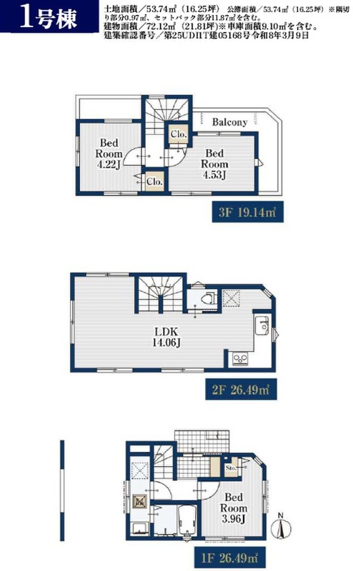 | 建物面積 | 72.12m2(車庫面積9.10m2を含む) | 土地面積 | 53.74m2(隅切り部分0.97m2、セットバック部分11.87m2を含む) |