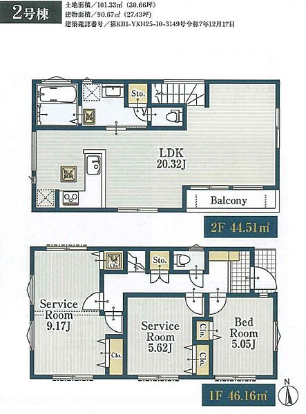 2号棟 間取り 1LDK+2S 価格 5180万円 建物面積 90.67m2 土地面積 101.33m2
