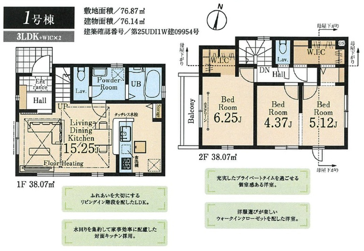1号棟 間取り 3LDK+2WIC 価格 7480万円 建物面積 76.14m2 土地面積 76.87m2