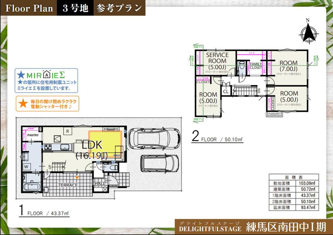 3号棟 間取り 3SLDK+ファミリークローゼット+パントリー 価格 8790万円 建物面積 93.47m2 土地面積 103.09m2