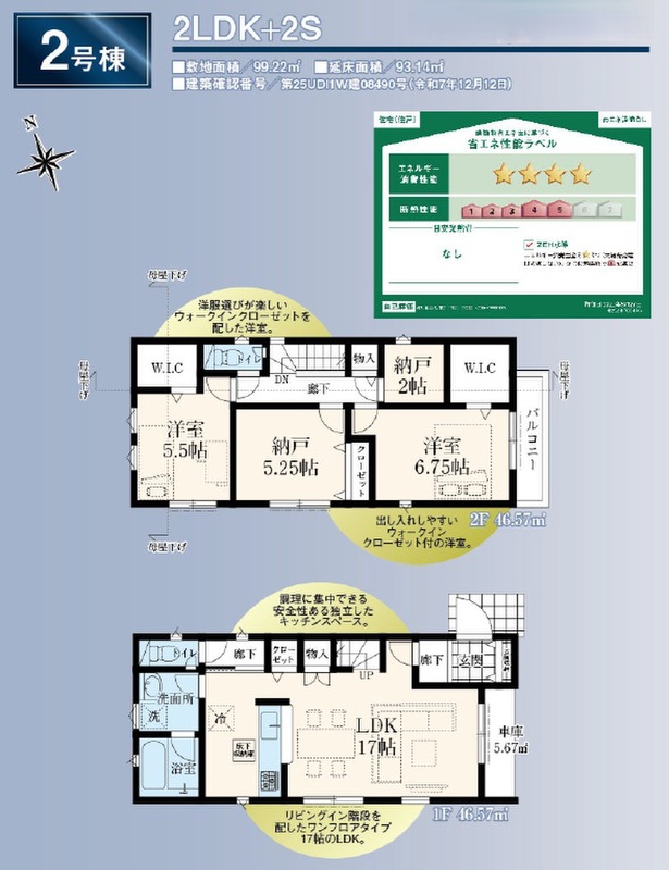 2号棟 間取り 2LDK+2S+WIC×2 価格 6580万円 建物面積 93.14m2 土地面積 99.22m2 -