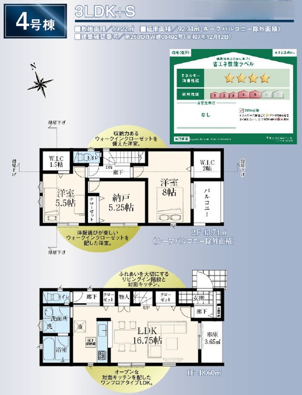 4号棟 間取り 2SLDK+WIC×2 価格 6580万円 建物面積 92.34m2 土地面積 99.22m2