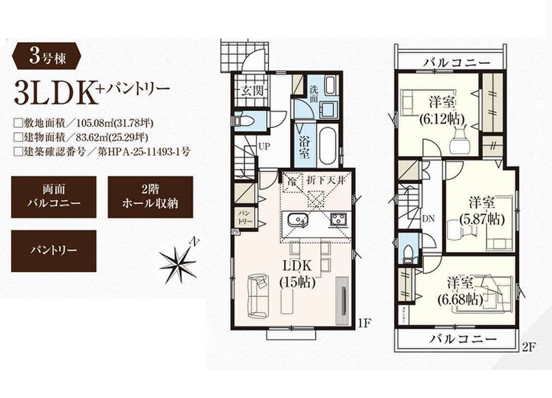 3号棟 間取り 3LDK+パントリー 価格 6490万円 建物面積 83.62m2 土地面積 105.08m2