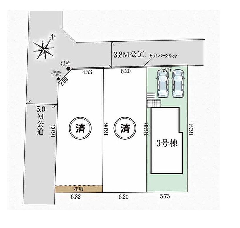 | 駐車場 | 1台 ~ 2台 | 道路の幅員 | 北西側3.64m公道(セットバック後3.82m) |