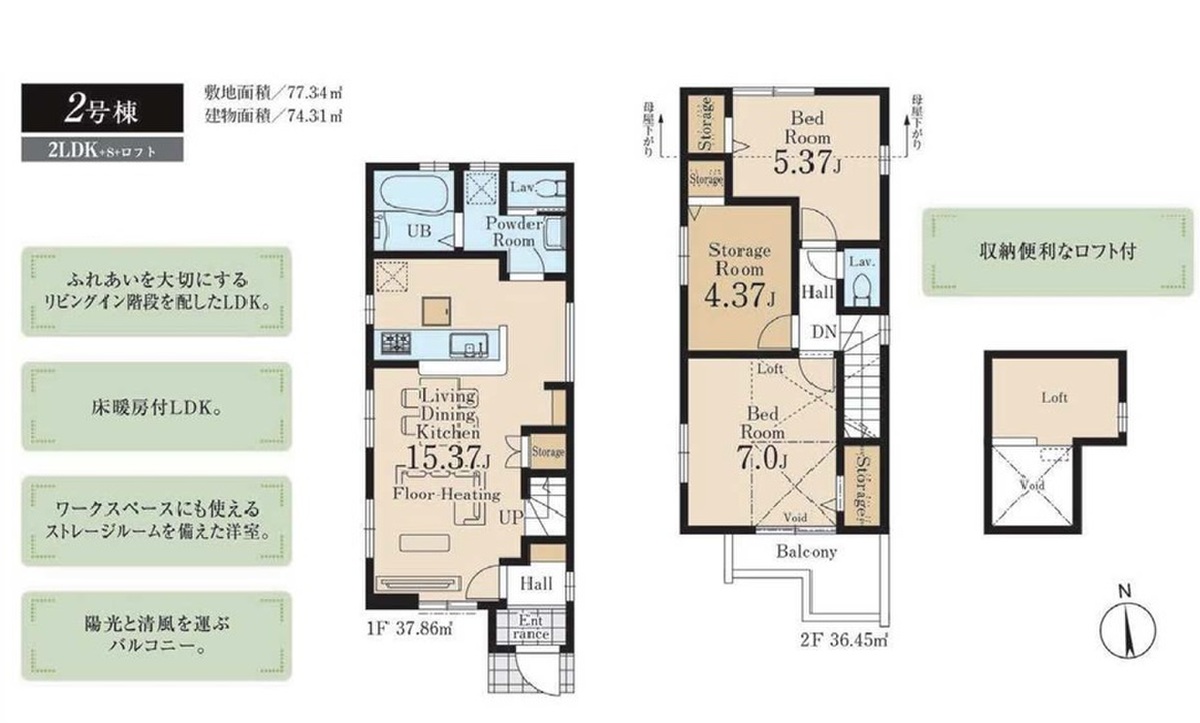 2号棟 間取り 2LDK+S+ロフト 価格 9690万円 建物面積 74.31m2 土地面積 77.34m2 -