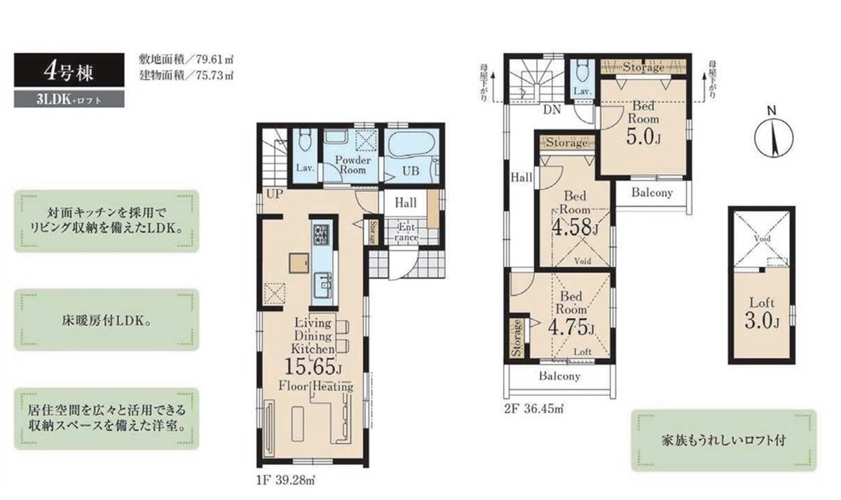 4号棟 間取り 3LDK+ロフト 価格 9490万円 建物面積 75.73m2 土地面積 79.61m2 -