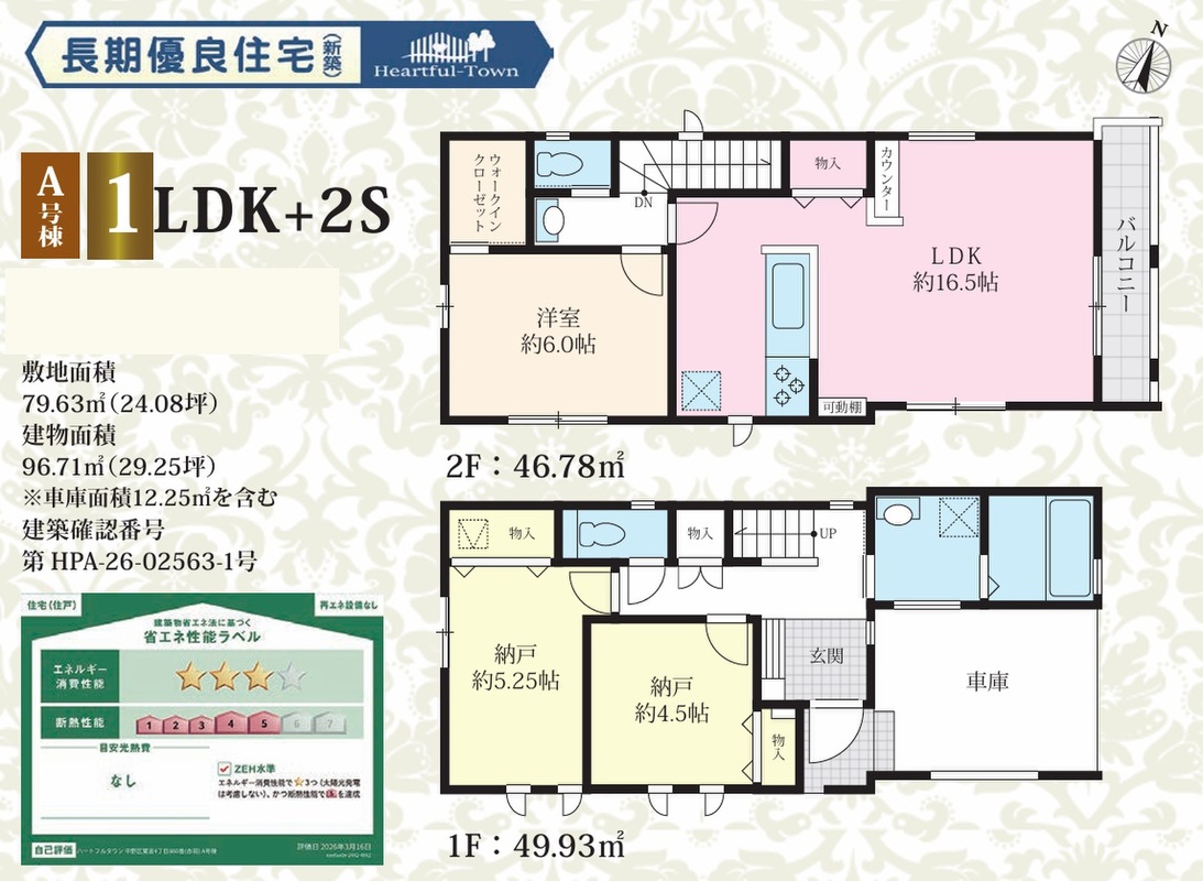 A号棟 間取り 1LDK+2S+WIC 価格 8490万円 建物面積 96.71m2(車庫面積12.25m2含む) 土地面積 79.63m2