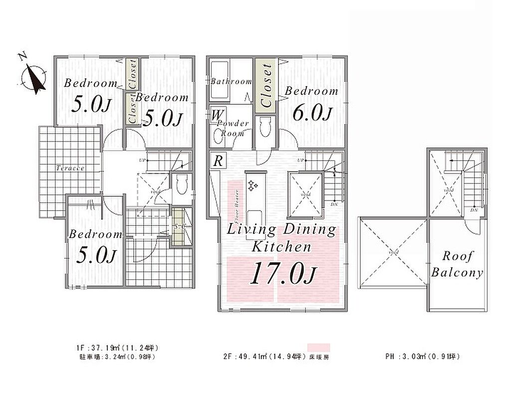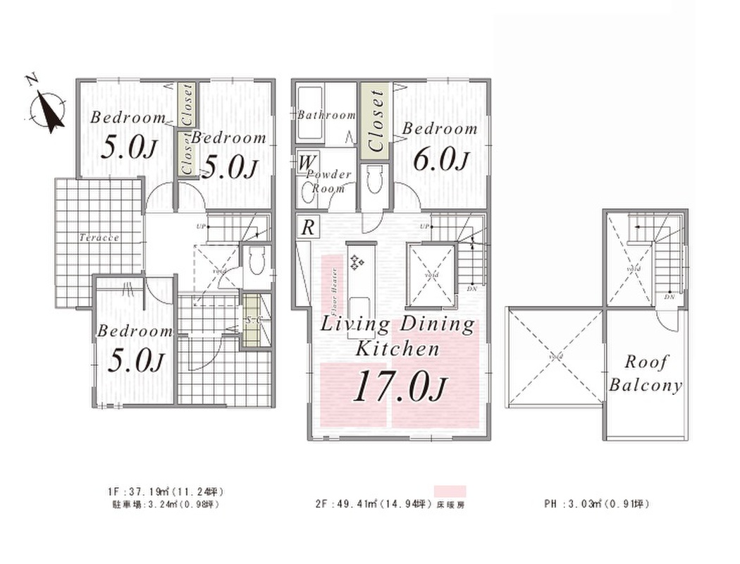 17.0帖LDK×収納付きの居室が4部屋!ご家族の会話を重視したリビングイン階段!広々テラス、ルーフバルコニー付4LDK!ガスを効率よく使えるハイクオリティ熱源器「エコジョーズ」標準装備!