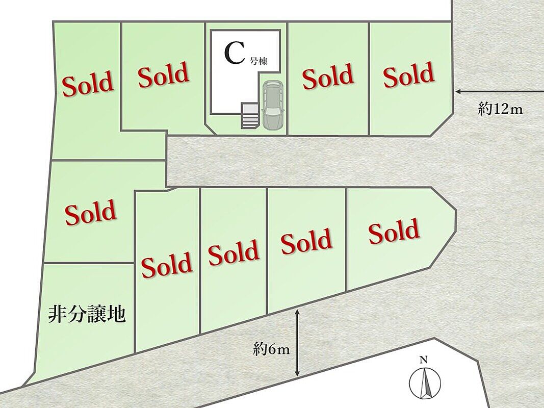 | 駐車場 | 1台 | 道路の幅員 | 分譲地内道路:約4.5m、南側:約6m、東側:約12m |