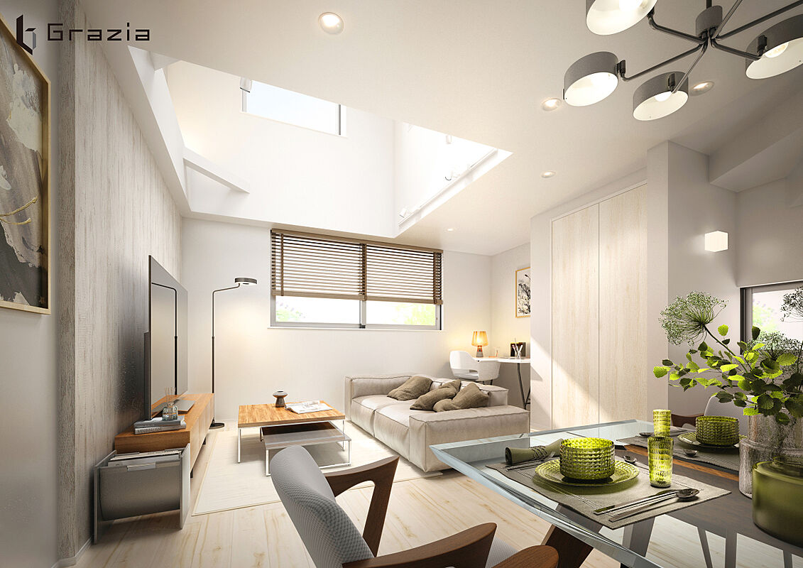 新築一戸建て 【残り2棟】~Grazia 練馬桜台~ リビングから石神井川の桜を望める開放的な吹抜天井設計