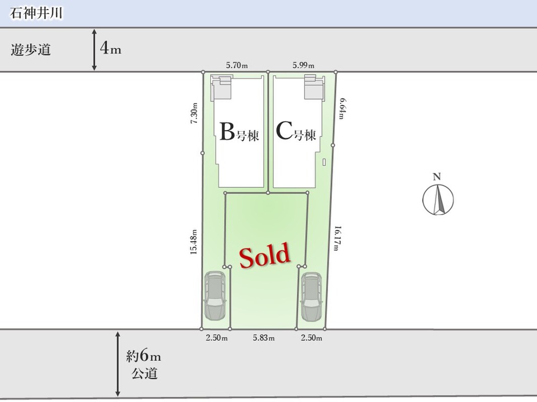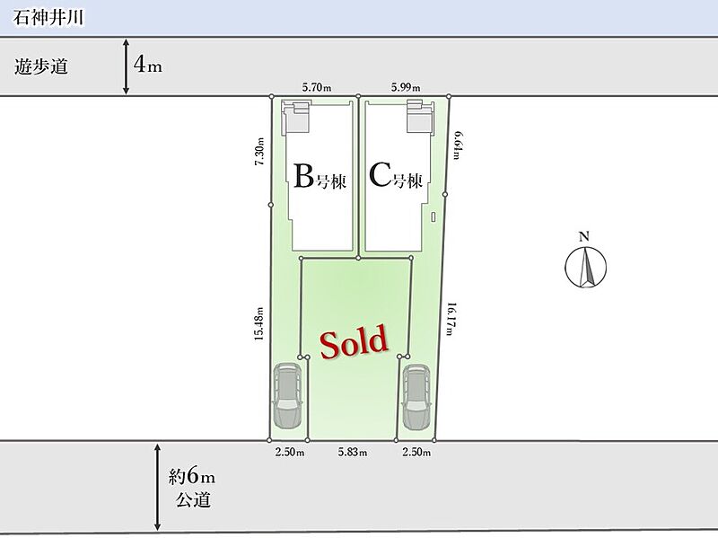 | 駐車場 | 1台 | 道路の幅員 | 南側:約6m(公道)、北側:遊歩道 |