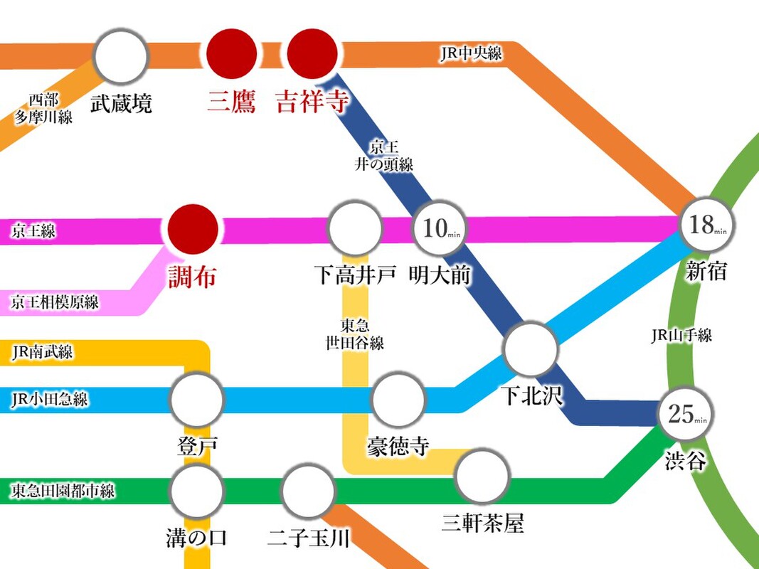 ◆ 中央線「吉祥寺」駅バス込み35分、「三鷹」駅バス込み24分、「調布」駅バス込み24分で利用可能。近くのバス停まで徒歩4分で行くことが出来ます。
