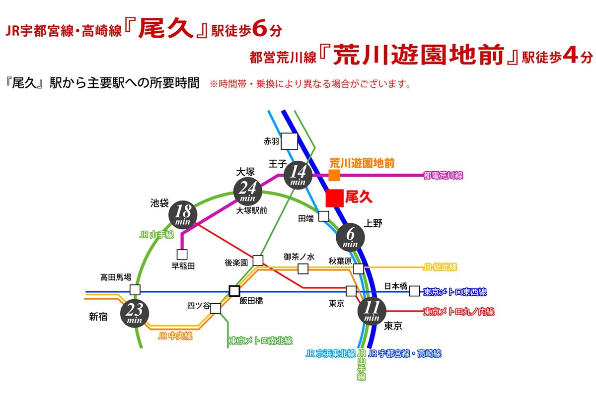 - JR東北本線「尾久」駅 徒歩6分都電荒川線「荒川遊園地前」駅 徒歩4分JR高崎線「尾久」駅 徒歩6分
