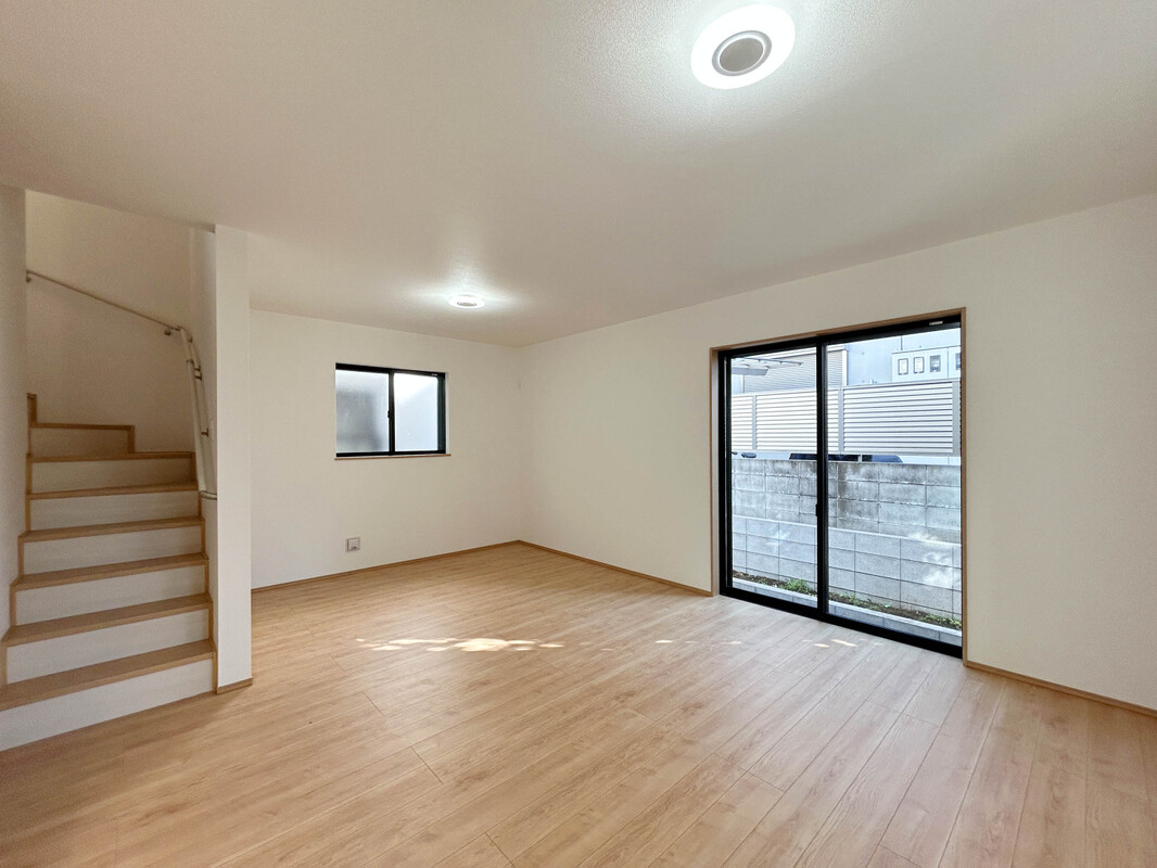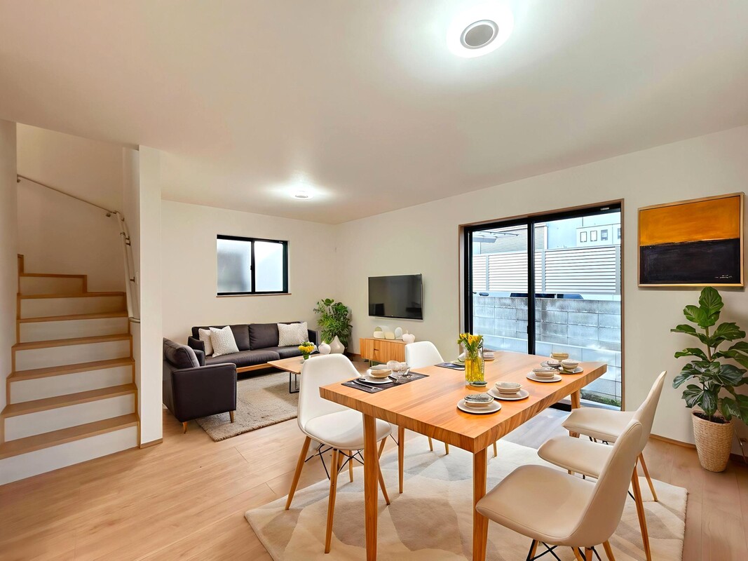LDKは広々20.5帖!3面採光で陽当たりがよく、リビング階段とカウンターキッチンによって家族の絆が深まりやすい造り。