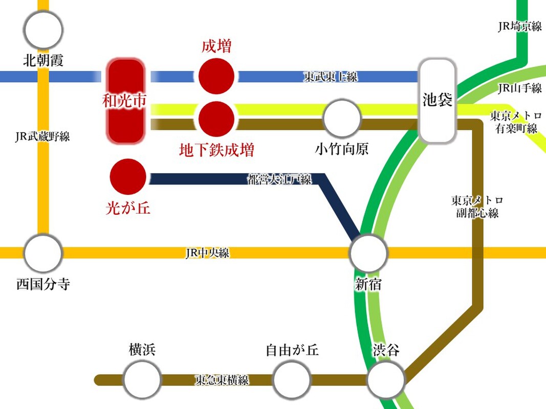 - 東武東上線「和光市」駅 バス乗車10分「もみじ山」 徒歩7分都営大江戸線「光が丘」駅 バス乗車15分「別荘橋」 徒歩2分東京メトロ副都心線「地下鉄成増」駅 バス乗車9分「和光市南」 徒歩10分
