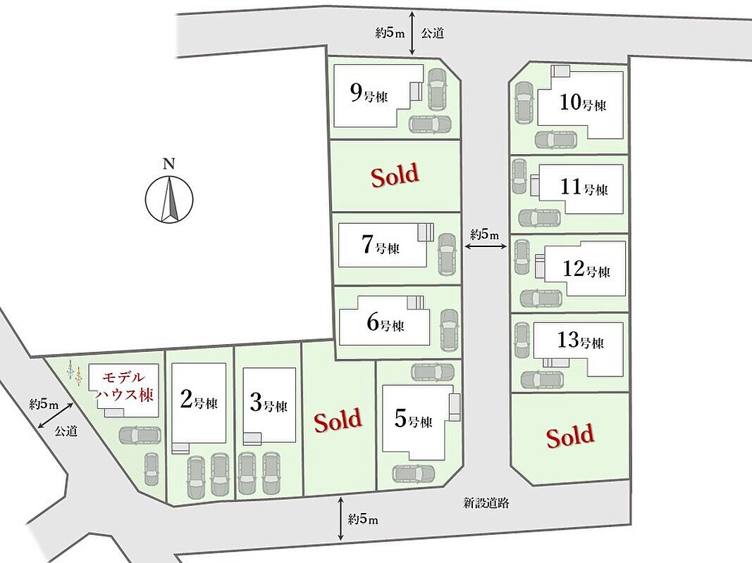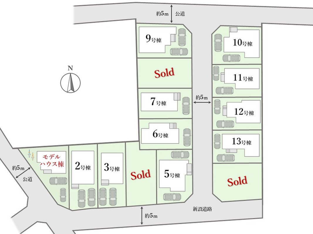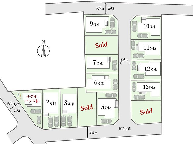 | 駐車場 | 1台 ~ 2台 | 道路の幅員 | 北側:約5m(公道)、西側:約5m(公道)、新設道路内:約5m |