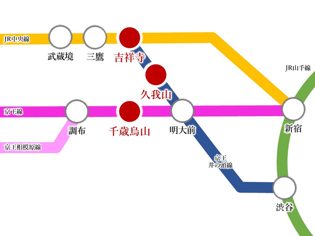 - 京王井の頭線「久我山」駅 京王電鉄バス7分「真福寺」バス停 徒歩10分JR中央線「吉祥寺」駅 小田急バス21分「北野小束」バス停 徒歩4分京王線「千歳烏山」駅 バス14分「下本宿」バス停 徒歩4分