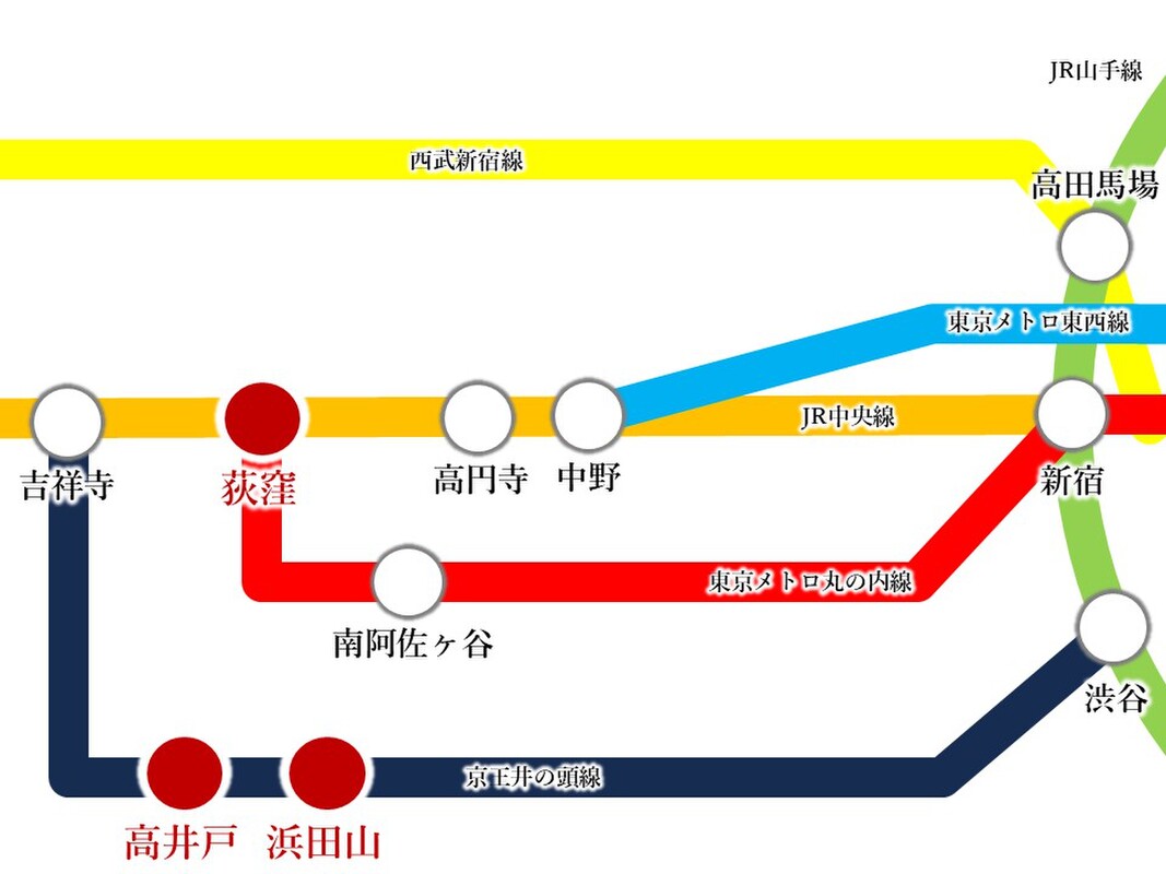 JR中央線「荻窪」駅 徒歩20分 京王井の頭線「高井戸」駅 徒歩17分 京王井の頭線「浜田山」駅 徒歩20分 |